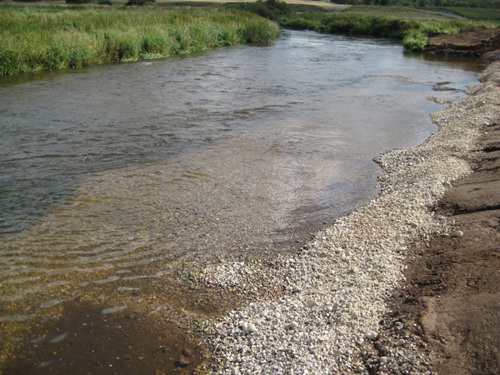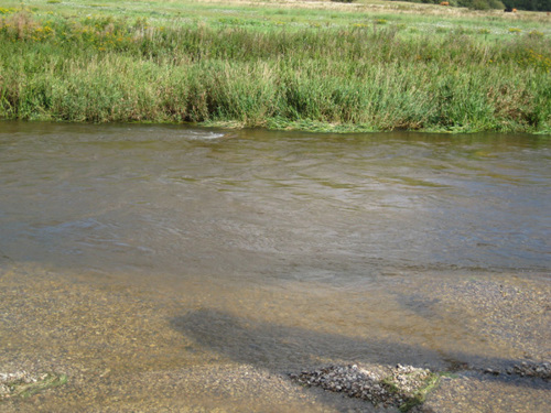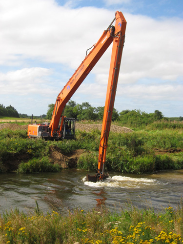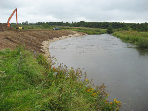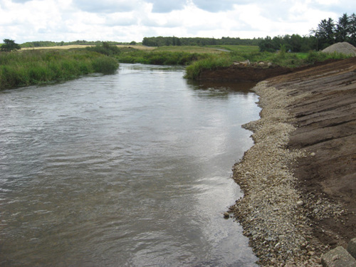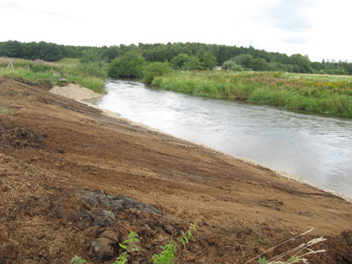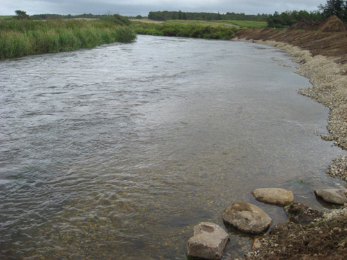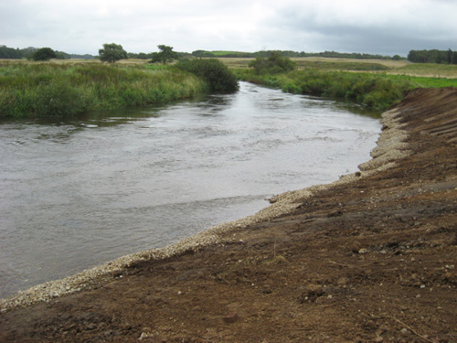Åen udvides og der lægges gydegrus på lavt vand. (vi kigger ned mod Bur Bro).