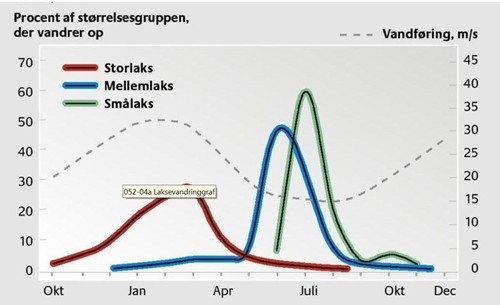 Figur 1. Fordeling af laksetyperne storlaks, mellemlaks og smålaks/grilse i vandløb i forhold til tidspunkt på året. Vandføring er ligeledes plottet. Laksedata er fra den naturlige laksebestand i Gudenå i perioden 1900-1915.